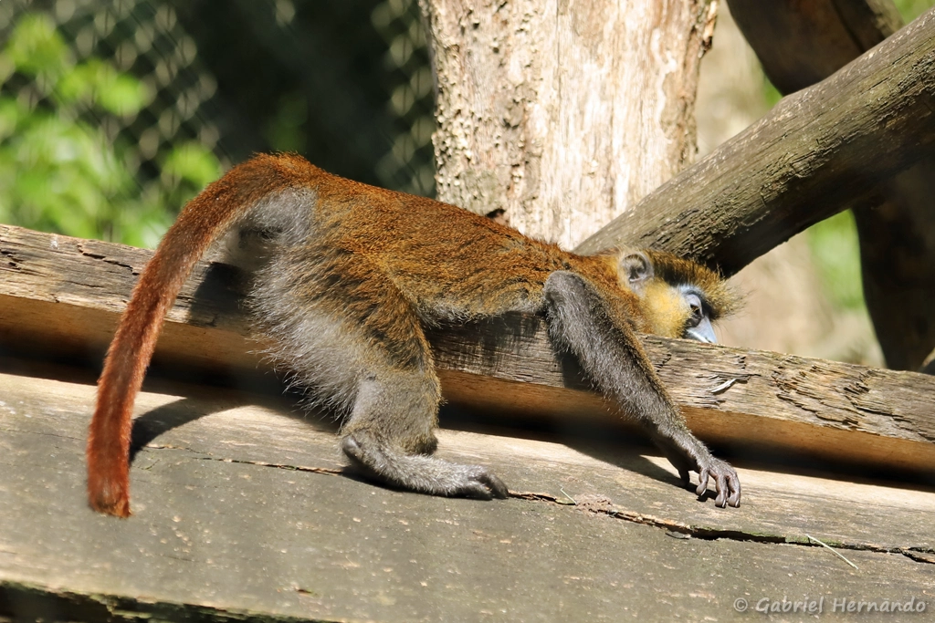 Ce petit singe est distribué en Afrique équatoriale, du fleuve Sanaga jusqu’au fleuve Congo. Son aire de répartition couvre donc l’Angola, le Cameroun, la République centrafricaine, le Congo, la République démocratique du Congo, la Guinée équatoriale et le Gabon. Il fréquente les forêts et les galeries forestières bordant les cours d’eau traversant la savane.