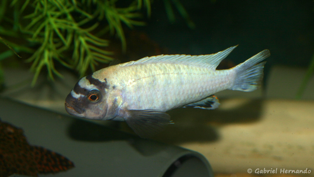 Le patron mélanique des mâles est blancs légèrement bleuté, avec des barres bleus très légèrement marquées. Sa tête est bleu foncé à noire avec deux barres inter-orbitaires bleu. Las nageoire dorsale et caudale sont de la même couleur que le patron mélanique, avec de la la membrane inter-rayons devenant transparente à partir du pédoncule caudal. La nageoire anale est de la même couleur, avec une bande submarginale de couleur noire et 2 à 4 ocelles. Les nageoires pelviennes sont noires avec une bordure extérieure blanche. Les femelles ont un patron mélanique gris-brun terne et peuvent être dificile à distinguer des femelles d’autres espèces de mbun similaires, comme Pseudotropheus perspicax. Lorsque les mâles sont soumis à un stress, ils ont la capacité de changer de couleur presque instantanément du bleu-blanc au gris-brun terne des femelles.