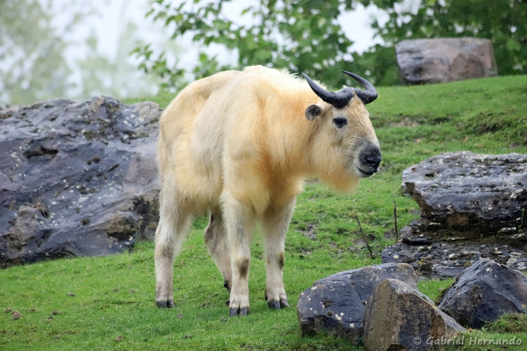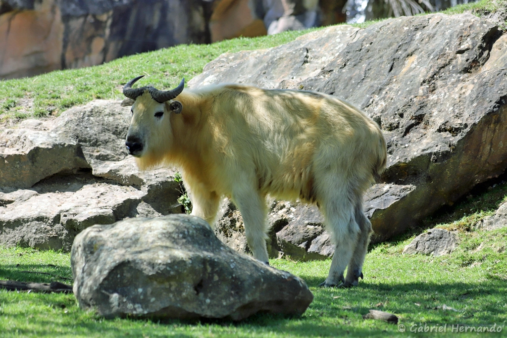 Budorcas taxicolor bedfordi, le takin doré, présente une fourrure variant du brun au jaune presque couleur or.