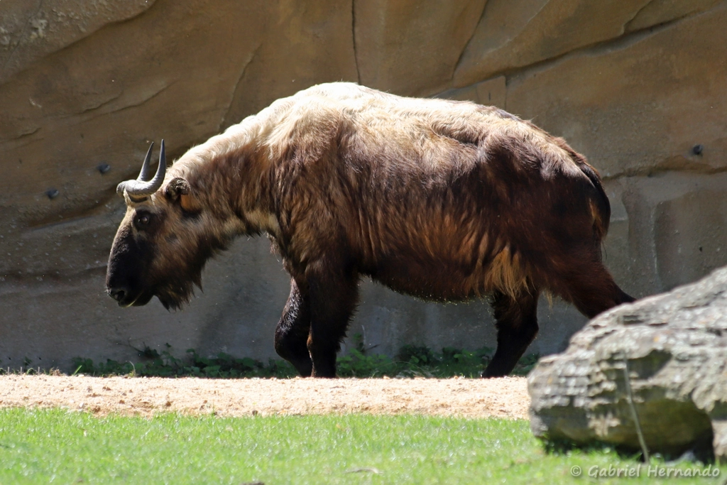 Le Takin est distribué en Asie, où il fréquente les montagnes de l’ouest de la Chine ou dans l’Himalaya. Il est classé comme vulnérable, sur la liste rouge de l’IUCN. Ce bovidé caprin ressemble au gnou africain. Les Takins possèdent une longue et épaisse fourrure qui les protèges des températures extrêmes des hauts sommets asiatiques. Leur fourrure varie du marron brun au jaune presque couleur or. Les takins comprennent 4 sous-espèces :